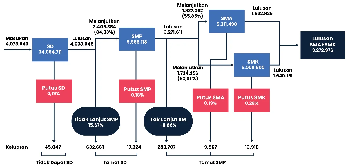 Gambar di atas menunjukkan belum 100 persen siswa lulusan SD yang lanjut ke SMP. Dari 4 juta lulusan SD pada tahun ajaran 2023/2024 hanya 3,4 juta atau 84,3 persen yang lanjut ke SMP, dengan angka putus sekolah mencapai 0,19 persen.