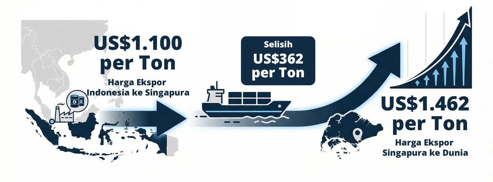 Peran Singapura sebagai hub perdagangan global dan re-ekspor menjadi kunci dalam dinamika ini. Selisih harga dan anomali data yang teridentifikasi memperlihatkan bahwa sebagian nilai tambah berpotensi bergeser dari negara produsen (Indonesia) ke negara perantara (Singapura).